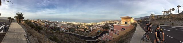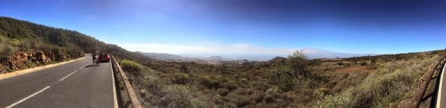 0600 ja automaattisesti ylös ja kahvia keittlemään. Yleistä kikkailua, facebookkia ja meilejä lueskellessa. 08.00 treffit ilkan kanssa respan edessä ja eka lenkki on tosi asia. Sartza väijyi parvekkeella puhelimen kanssa, jotta saa otettua päivän starttikuvan ja samalla tukittua somea kun olen itse estynyt. Ohjelmassa luki 2-3h kevyttä pyörää joten päätimme karttoja selatessamme lähteä hotellilta suoraan ylös Vilaflor nimiseen kylään. Se on ikäänkuin taite kohdassa. Siinä pitää päättää haluaako lähteä kipuamaan Teidelle päin vai jatkaa jotakin muuta reittiä jonnekkin alas päin. Feltti tuntui kiipeävän yllätävän hyvin ja en ollutkaa niin kovissa vaikeuksissa sykkeen tai jalkojen kanssa kuin kuvittelin. Tämähän sujuu oikein näppärästi. Vilafloriissa on kahvila jossa mageet punaiset Coca-Cola penkit terassilla. Terdellä on auringon paisteessa hieno nauttia vaniljakreemi pullaa ja kokista. Kylä ja kahvila on aika korkealla. 1370 m merenpinnasta ja yhtäjaksoista nousua hotellilta on 1100 m kun taas laskua on vain vaivaiset 4 m jotka tulevat kun respasta laskee päätielle… Päätimme laittaa tuuliliivit päälle ja suunnata alas päin, mutta erikautta kuin mistä tultiin. Otimme suuntimaksi Granadilla nimisen kylän jä lähdimme tykittelemään mutkaista vuoristotietä sinne. Hienoa tietä laskea ja ne maisemat…