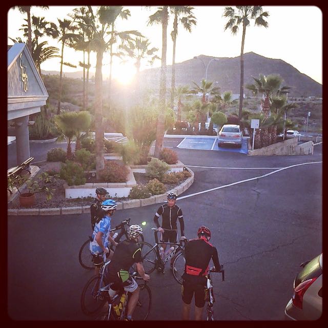 Aamu starttasi kuin kaikki muutkin aamut. 0800 respan pihalta Sartzan ottaman startti kuvan jälkeen. Uutena lenkkivahvistuksena Sari S. Ajoimme saman reitin kuin sunnuntaina, mutta otimme opiksi viimekertaisesta sen verran että Ilkka oli tarkastanut Google Mapsista missä olimme ajaneet väärin. Tällä kertaa pääsimme oikealle reitille. Ohjelmassa oli 3-4 h ajoa joka sisältäisi 2 x 15 min mäkeä Aerk. Ennen Las Vegasia ajoimme yhden setin, tai siis muilla oli 30 min ja mulla se 15 min. Joka on muuten aika pitkä aika sekin polkea hieman kovemmiin tuollaista mäkeä ylös. Sykkeet paukutteli jo perus ajossa lähellä syksyllä testissä saatua Aerk rajaa, mutta tuntuma oli eri joten nostin vauhtia hieman. Syke noin 10 lyöntiä yli testituloksen ja homma tuntui rokaavan. Mentiin sillä. Ajoimme siis Las Vegas nimiseen paikkaan, joka on tosin umpikuja. Joo mutta ainostaan valokuvan takia kiipesimme 3 km 10-15% nousua. Heh. Sieltä sitten Granadillaan jätskille ja kokikselle. Josta matka jatkui taas vaihteeksi Vilaflorille. Tässä välissä oli toinen noista vedoista. Se meni samalla kaavalla kuin eka. Ja pumppu löi samaa tahtia. Lopussa hieman ehkä nousujohteista lukemaa oli ruudussa. Tässä viimeisessä vedossa jäin jo porukasta kun alkoi jalassa painaa ja sykkeiden mukaan kuitenkin ajoin. Loppu nousu olikin sitten hieman piukempaa. Painelin kuitenkin yhden puuskuttavan sakemannin ohi. Pysähdyin kuselle. Sakemanni meni ohi. Poljin hänet taas kiinni, ja ohi. Se oli selvästi aika loppu jo. Jäi piru hinkaamaan vaihteitansa iah ntakarenkaasee nkiinni. Mihän en mikään veturi ole. Nostin vauhtia. Nousu oli perus 6-7 prosenttista. Painelin + 20 km/h vauhtia mäkeä ylös välittämättä sykeistä, koska tuo kaveri jää nyt! Ja kyllä muuten jäi. Muu porukka odotteli eräässä risteyksessä niin mun karkumatka hommat jäi aika lyhyeksi mutta ei se mulle olis pärjänny. Hah!