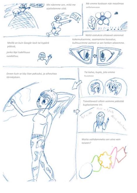 Me emme koskaan näe maailmaa sellaisenaan. Meillä on kuin silmälasit, kypärä tai kupla ympärillämme, jonka läpi maailmaa tarkastelemme. Saamme tietomme maailmasta aina välikäden kautta, aistien kautta, emme siis koskaan suoraan. Aistien läpi suodattuva tieto kulkeutuu vielä ajatuksellisten suodattimien kautta, joita päähämme ovat iskeneet niin vanhempamme kuin muut läheiset kasvaessamme. Toimintaa ohjaavia ajatuksia ajatusmalleihimme pyrkii yhä lisäämään nykyinen ja alati muuttuva kulttuurimme sekä lähipiirimme juuri nyt. Heidän sanojensa ja tekojensa kautta olemme oppineet, mikä on oikein, mikä väärin, mikä loogista ja mikä vain typerää.