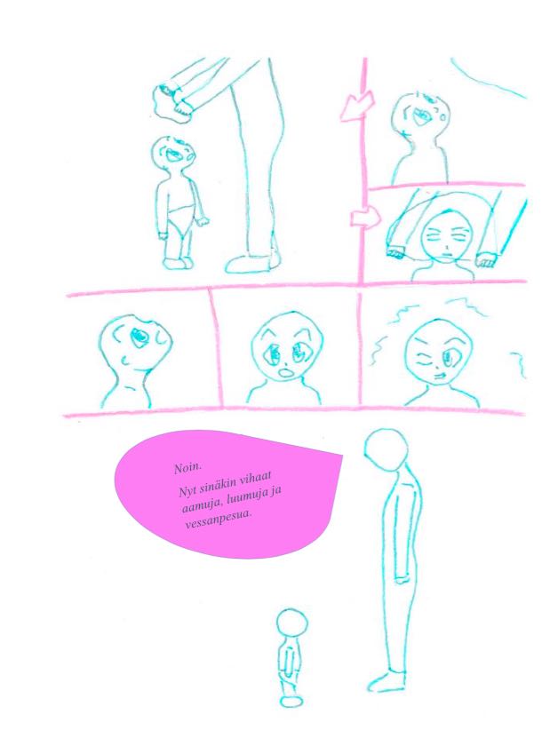 En myöskään ymmärrä logiikkaa, jolla saan minimikorvausta äitiyslomalla. Se, että hankin koulutuksen ja synnytän nuorena, näyttäytyy rahan logiikan mukaan pahalta asialta. Eivätkö nämä kaksi asiaa olleetkaan hyviä ja tavoiteltavia asioita? En ehtinyt kerätä itselleni rahaa, joten en saa korvauksiakaan paljon. Miksei minua tämän sijaan kiitetä ja palkita siitä, että olen toteuttanut oikeita asioita oikeaan aikaan opiskellen ahkerasti ja kiireellä, ja vielä synnytänkin nuorena, jolloin lapsi on todennäköisemmin terve. Miksei minulle anneta suuria äitiyskorvauksia, koska oikeiden asioiden suorittamisen vuoksi en ehtinyt vielä kerätä itselleni rahaa? Ne sen sijaan, jotka synnyttävät vanhana ja rikkaana, eivät tarvitse rahaa koska ehtivät kerätä sitä äitiyden varalle. Meidän maailmassamme tällainen logiikka taitaa kuulostaa aivan typerältä.