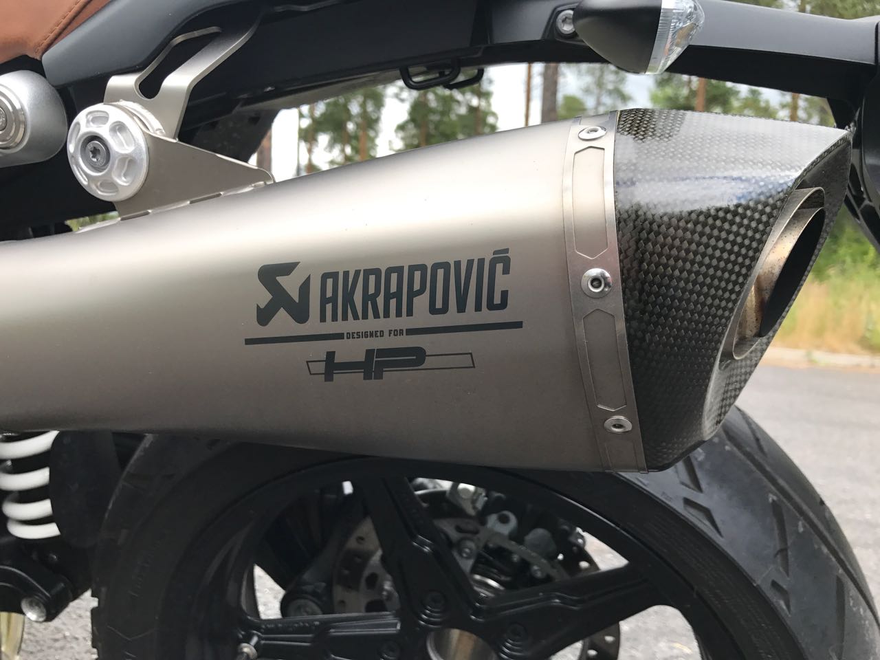 Boxerin omankaltainen terävä ääni hellii korvi,a kun pyörää hapettaa isolla kädellä. Akran äänimaailma on todella onnistunut. Penkki on mukava istua ja moottoritiellä on helppo hakea vähän pidempää asentoa ja ohjata ilmaa yli. Voisin kuvitella ajavani BMW Nine T Scramblerilla pidemmänkin siivun, reppu selkään ja couchsurfing reissulle.