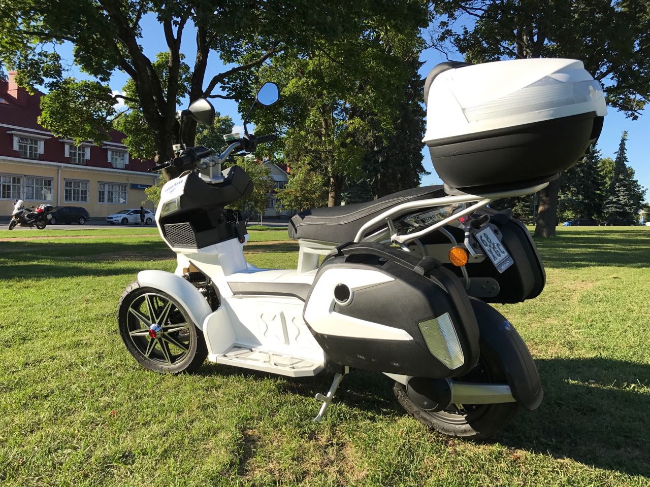 First impression was a good build quality. Every switch and structure feels well made. Despite its appearance the scooter, it will not stay up on its own and it feels very slippery. So first to notice is that it’s not a trike, but a scooter with dual front wheels.