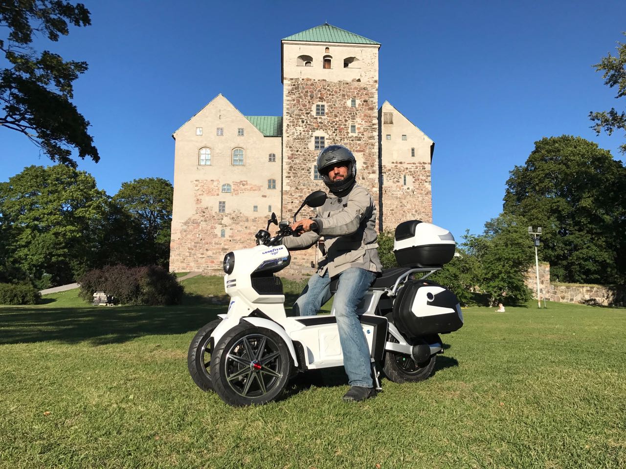 Ja kun mainitsin että sympaattisen näköinen ajopeli herättää keskustelua missä sen kanssa liikkuukin niin tässä hyvä esimerkki. Pitkällä roadtripillä ollut Ranskalainen motoristi tuli juttelemaan kun kuvattiin laitetta Turun Linnan luona. Juteltiin pitkään niitä näitä ja kävipä hän ajamassakin sillä korttelin ympäri. Oli kyseessä mopo, skootteri tai moottoripyörä niin motoristit tulevat aina juttuun keskenään. Hänen matkaansa voit muuten seurata Instagramissa osoitteessa: www.instagram.com/tranber55/