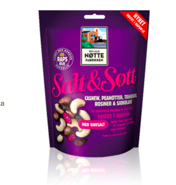 Salt & Søtt on mielenkiintoinen sekoitus rapsiöljyssä paahdettuja suolapähkinöitä, kuivattuja hedelmiä sekä suklaakuorrutteisia rusinoita ja maapähkinöitä.Erinomainen sekoitus toisiaan täydentäviä suolaisia ja makeita makuja, 310 gSalt & Søtt on aivan uusi ja herkullinen sekoitus suklaakuorrutteisia rusinoita ja maapähkinöitä, kevyesti suolattuja cashew-pähkinöitä ja maapähkinöitä sekä makeita karpaloita ja rusinoita. Se on täydellinen silloin, kun olet menossa tai kaipaat viikonloppuherkkua. Tai kun mielesi tekee terveellistä välipalaa.Tämän pähkinäpussin pähkinät on