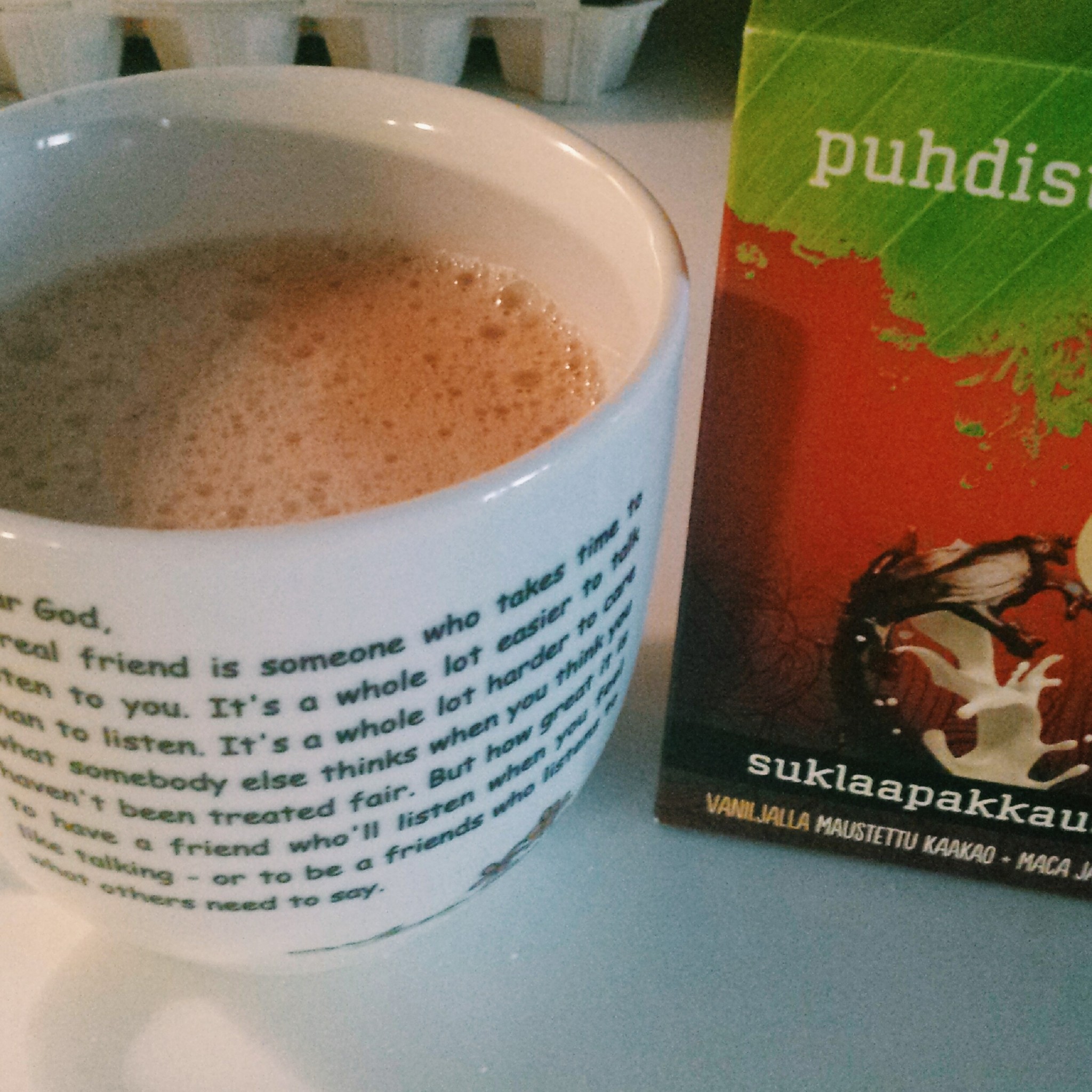 Sananen täytyy tosin ehkä kertoa. Muut kahvit ovat ihan perus mantelimaidolla tai hasselpähkinä-riisijuomalla terästettyjä mutta tuo missä on Puhdistamon suklaapakkaus mukana syntyi siten että perus latte mantelimaitoon (muistaakseni) ja siihen 1tl Puhdistamon suklaapakkausta mukaan, tiukka sekoitus ja nauttimaan! Äärettömän hyvää ”suklaakahvia” – NAM!