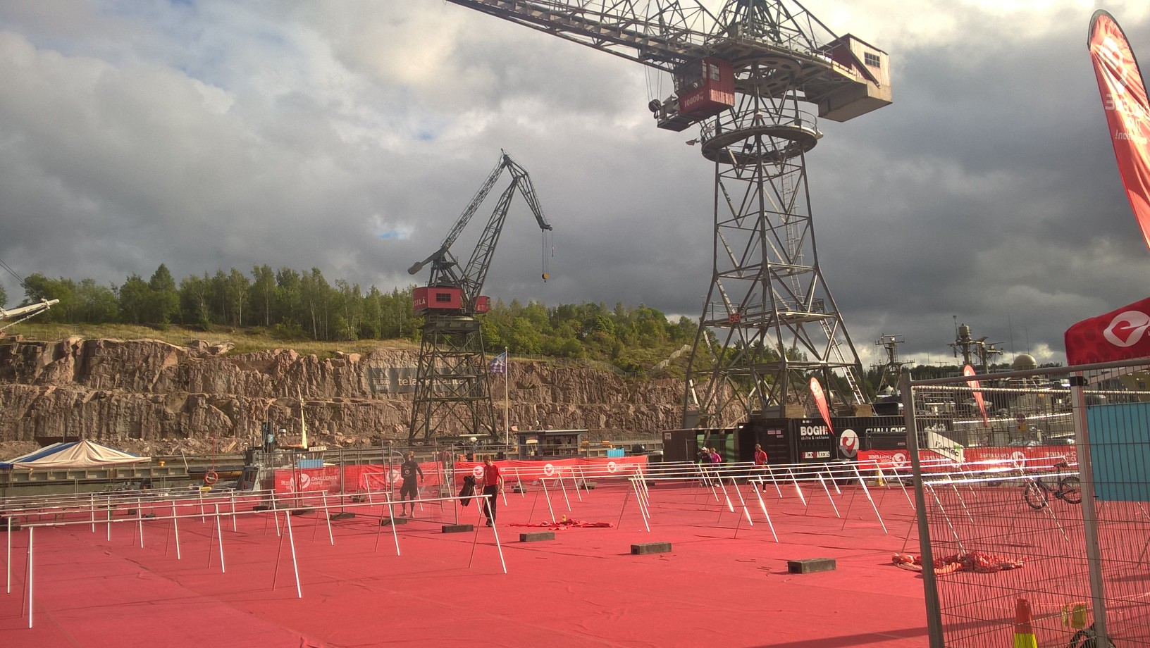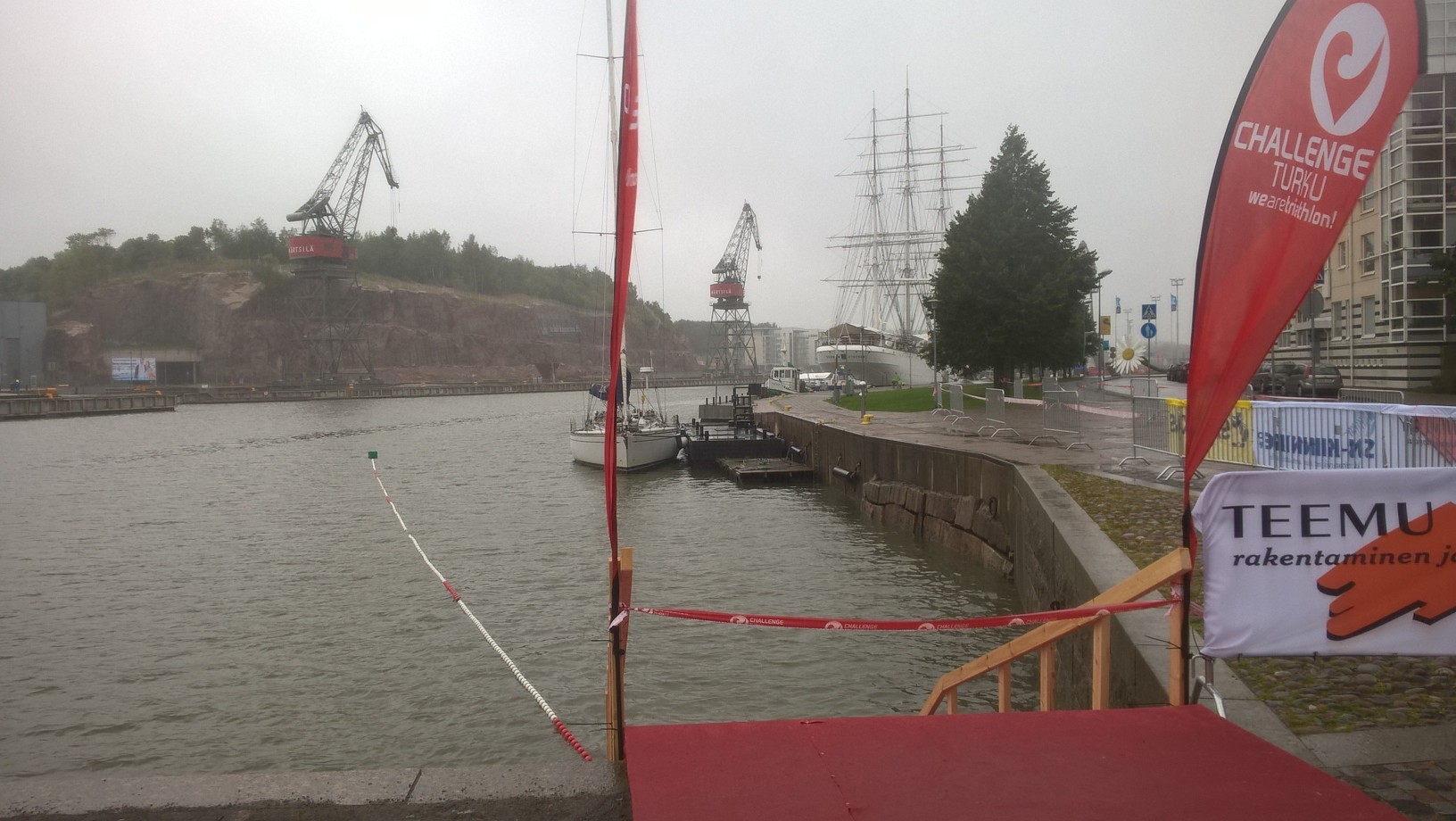 Lauantaina kävin lyhyellä aamulenkillä tutustumassa kisapaikkaan ja hieman hämmästellen katselin Aurajokeen, että tuonneko sitä tosiaan mennään uimaan huomenna 😀 ? Mietin vain, että hyvä ettei tarvitse yksin sinne pulahtaa, se vähän hirvittäisi 🙂 . Uintipoijuja ei ollut vielä nähtävissä, eikä reittiä siis oikein hahmottanut, mutta ihan ymmärrettävää ettei tuollaisessa paikassa voi poijuja pitää kauaa paikallaan, vaan ne asetettiin puolimatkaa varten vasta sunnuntaiaamuna ennen kisaa.