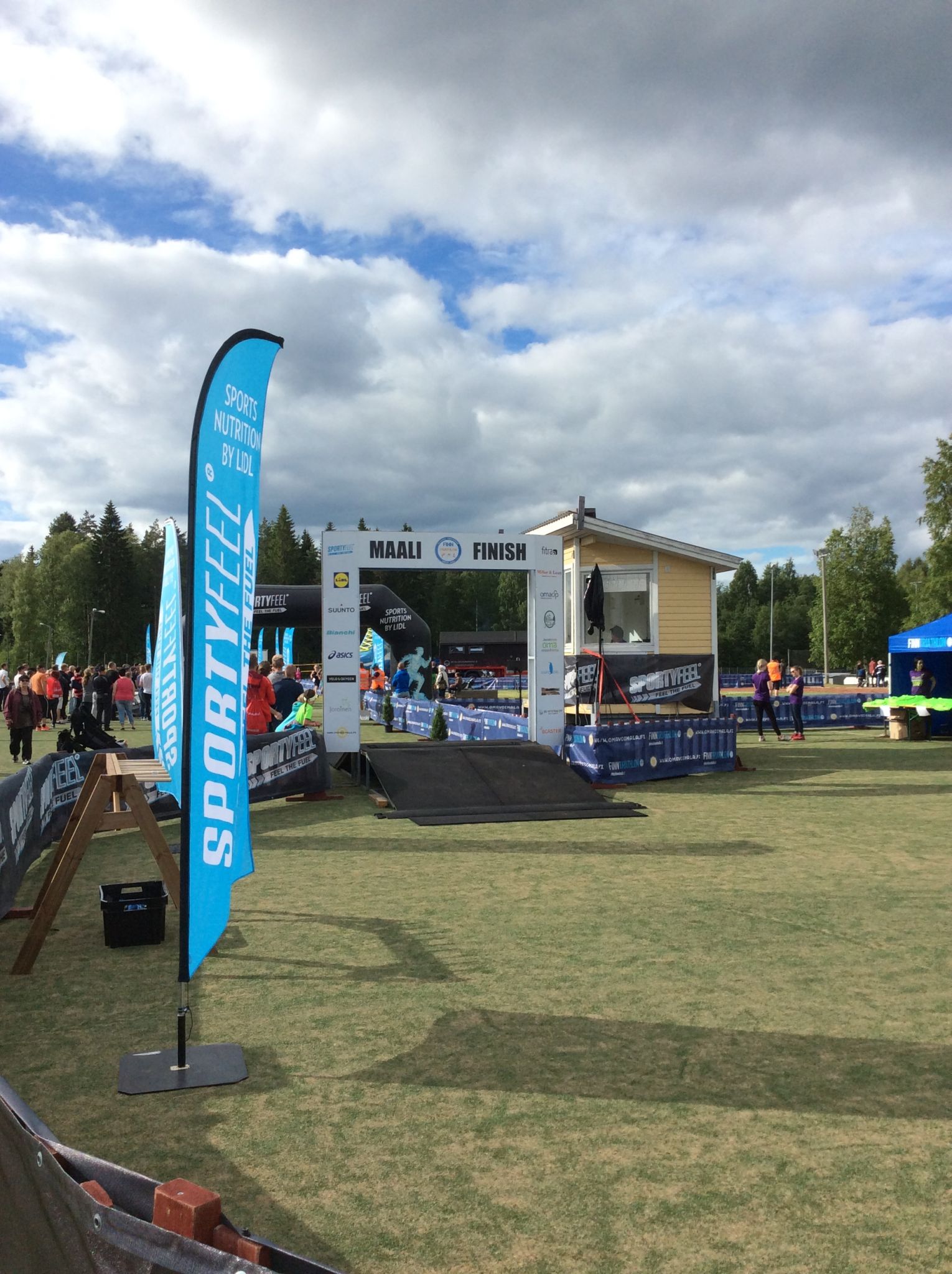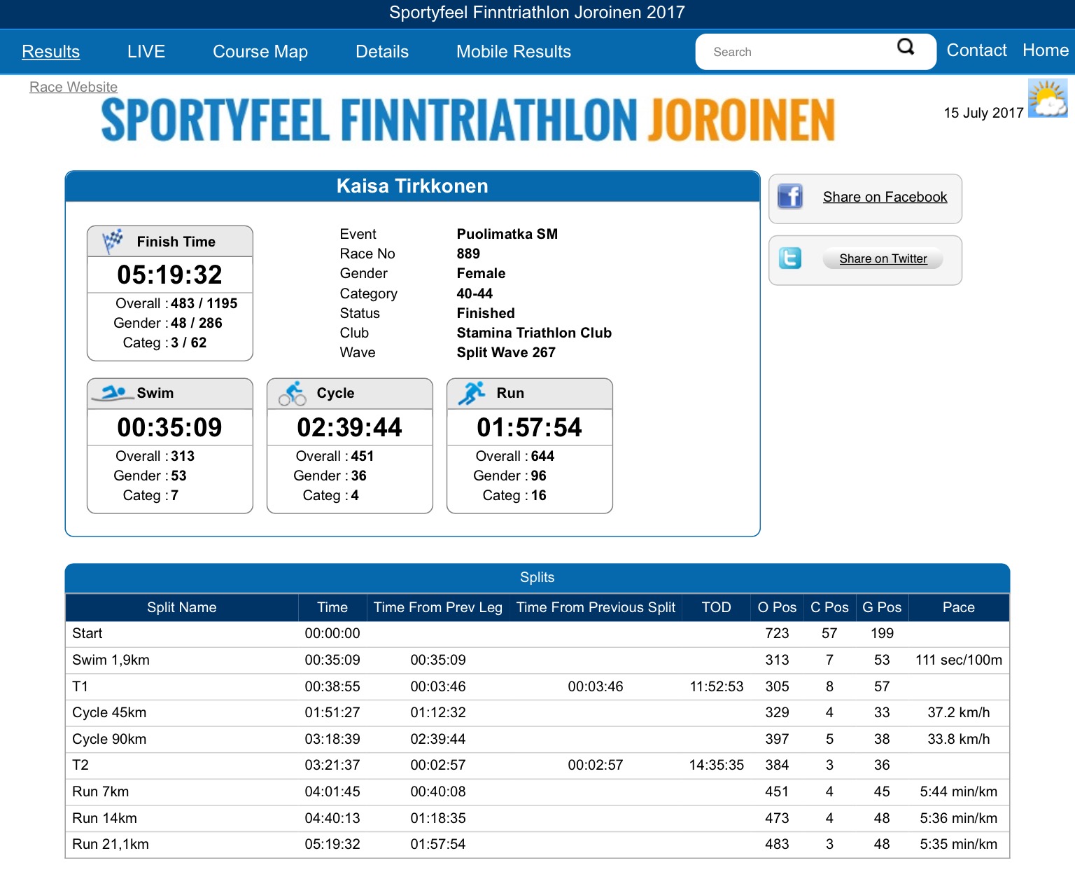 On se juoksu kyllä raskasta tuohon uinnin ja pyörän päälle, ei siitä mihinkään pääse 😀 MUTTA toisaalta miten hieno tunne se on, kun pystyy kuitenkin juoksemaan sitä omaa enkkavauhtiaan ilman mitään ongelmia! Vaikka alkoi jo väsyttää niin tiesin että yhtään ei voi antaa periksi, jos haluan sen alle 2h puolimaran juosta 😀 ja se tuntui hyvältä että pystyi sinnikkäästi jatkamaan samaa vauhtia vaikka jo väsyi. Mahtava fiilis maalissa pysäyttää kello ja katsoa että aika oli 5:19 ja jotain päälle…että perhana soikoon ne omat tavoitteet täyttyi ja meni jopa alle 5:20 🙂