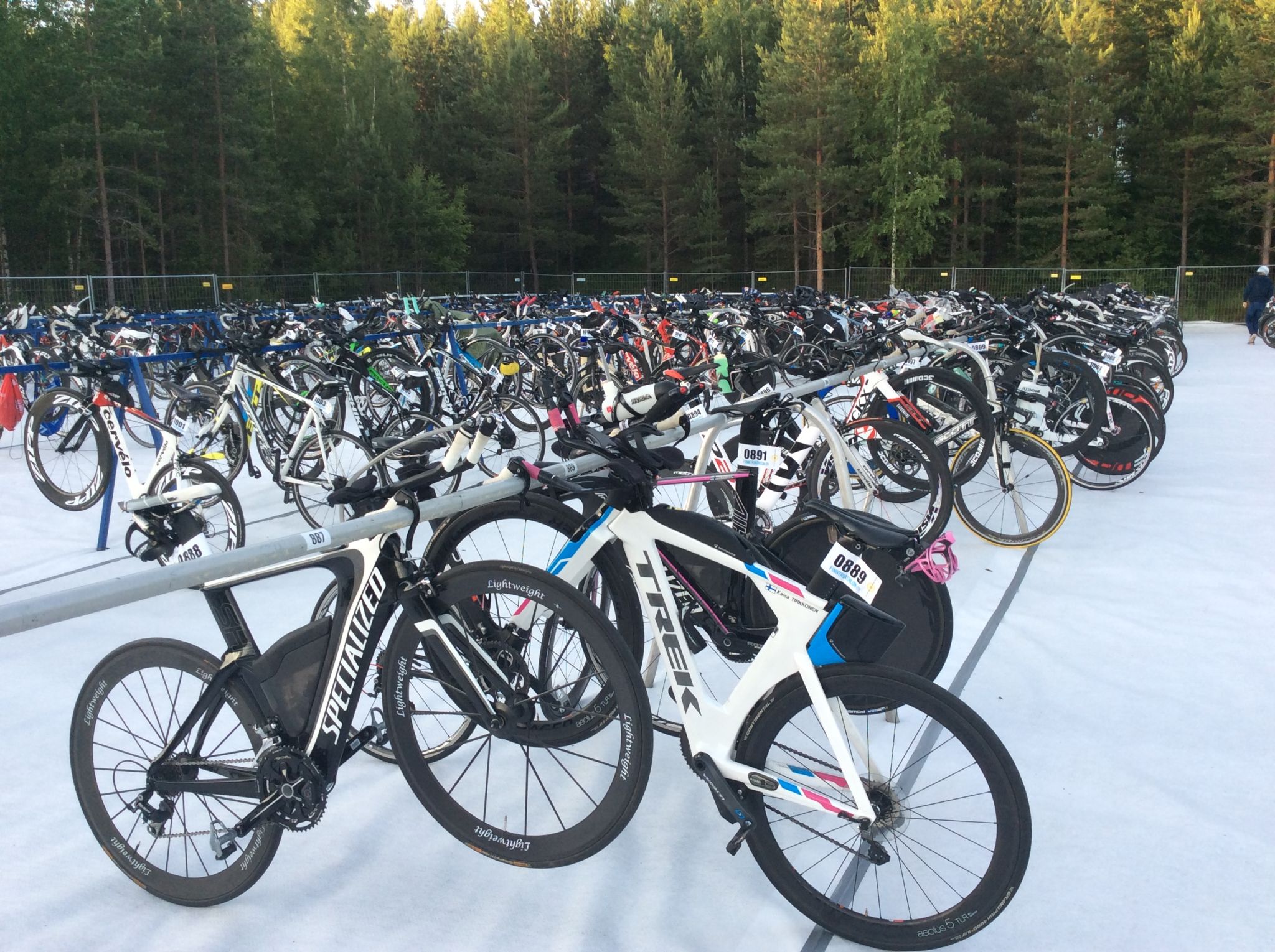 Joroisten kisassa on porukkaa niin paljon, että pyöräilyosuus on melkoista ruuhkaa. Verrattuna esimerkiksi Slovakian kisaan, jossa starttasin ensimmäisessä AG-lähdössä vain muiden naisten kanssa, niin paljon paremmin pystyi tekemään omaa tasaista ajoa. Joroisissa taas tasaisen ajon tekeminen on vaikeaa, kun jatkuvasti joutuu ohittelemaan ja puntaroit sitä että onko vauhti sopiva itsellesi tässä kohtaa vai vedätkö taas ohi edellä menevistä. Missään tapauksessa ei ollut tarkoitus tehdä mitään sunnuntai-ajelua, vaan oma hyvä, kova pyöräily, joten ohiteltava oli. Olen myös tottunut omissa treenimaisemissani selvästi ihan liian hyvää asfalttiin, kun pyöräosuuden tiet tuntuivat olevan melkoista perunapeltoa jälleen kerran 😀 . Pyöräily eteni kuitenkin ihan hyvissä tunnelmissa aika lailla suunnitelmani mukaan, menomatka Rantasalmelle (myötätuuliosuus) 36-37 keskarilla ja sitten paluumatkalla tavoite oli pitää vauhtia yllä siten että ehtisin vaihtoon alle 2h40min pyöräilyajan.