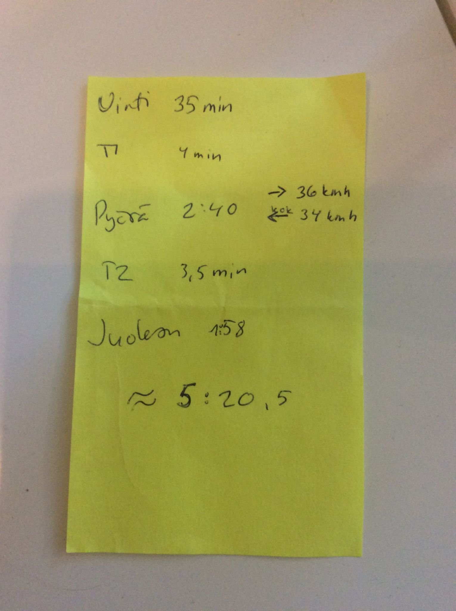Minulla on aina tapana tehdä ”kisasuunnitelma”, eli laskeskelen miten osuudet voisivat kulkea, ja mitä loppuaika sitten yhteenlaskettuna olisi. Loppuaikaan vaikuttaa tietysti reittien profiilit ja lopulliset pituudet, sää ja tuuli, lämpötila…mutta tykkään että on suunnitelma, sittenhän sen näkee mikä on toteuma. Suunnitelman pitää olla myös realistinen ja treeneihin perustuva, eli ei mikään ”parhaan mahdollisen päivän optimisuoritus”. Vierumäellä tosiaan jäin suunnitelmastani reilun pari minuuttia. Yhtä kaikki, raapustelin muistilapulle Joroisten kisasuunnitelman reilu viikko ennen kisaa ja se näytti tältä: