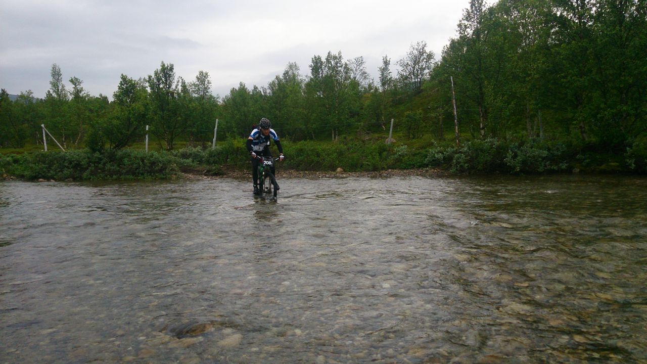 Kuudes etappi oli kisan pisin ja tässä vaiheessa tajusimme aikarajojen alkavan painamaan päälle ja meidän on nostettava vauhtia mikäli meinaamme ehtiä maaliin. Kuudetta etappia oli etukäteen myös varoitettu ehkä kisan raskaimmaksi etapiksi. Alkuun reitti seurasi merkittyä vaellus/ pyöräreittiä ja naureskelin miksi pyöräreittien merkkeihin oli laitettu ”pappapyörä”. Aikansa ajeltuamme saavutimme jälleen tanskan kaverit jotka olivat aiemmin päässeet edellemme. Myös pyöräreittien merkkien ”pappapyörän” kuva muuttui maastopyörän kuvaksi ja taas oltiin suolla tunkkaamassa. Varoituksen sana kaikille; jos menette Norjaan pyöräilemään ja ajatte merkattuja reittejä se ei tarkoita välttämättä sitä että reitit ovat ajettavia. Koska meillä oli kiire niin pyrimme tunkkaamaan niin nopesti kuin mahdollista ja heti kun ajaminen oli pienenkin pätkän mahdollista nousimme pyörien päälle. Suoalueen jälkeen matka jatkui kohtuullisesti ajettavissa oleva mönkijäuraa pitkin kunnes saavuimme erittäin nopeasti ajettavalle polulle. Hiekkapohjainen ajoittain pehmeä polku oli erittäin nopea ajaa. Ongelmia aiheutti tasaiseen tahtiin tapahtuneet vesistöjen ylitykset jotka saivat kuivan hiekan tunkeutumaan ketjuihin ja kaikkialle muuallekin pyörään. Tällä etapilla oli pakko pitää ylimääräinen huoltotauko ja putsata ketjut sekä rattaat ja iskettävä uudet öljyt. Pelko aikarajoista sai meidät polkemaan entistä nopeammin ja väliaikapisteelle saavuimme kellottaen kisan kolmanneksi nopeimman ajan, eikä kakkossijakaan jäänyt kuin minuutin päähän. Soussjavrella jälleen huoltomme toimi pikaisesti ja itse vedimme nopeat eväät ja pikaiset sananvaihdot kisan managementin kanssa ja takaisin tielle.