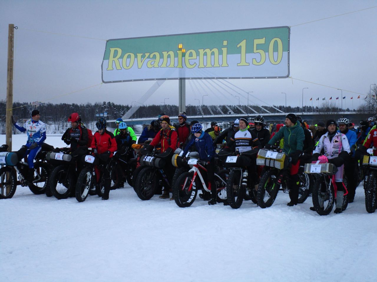 Kuusilammen huoltopisteellä oli hämmentävää tavata lyhyemmän matkan kärkiporukka. Jussi Karjalainen olikin nyt ensimmäisenä, Toni Lund toisena ja Ski Soini harmillisesti keskeyttäneenä polvivaivojensa takia. Jan Kopka, sekä muut 300km ajajat, olivat jääneet taakseni jo aikaisemmin. Fillari kulki hyvin ja sain ajettuakin monissa sellaisissa paikoissa, joissa Jussi ja Toni olivat taluttaneet. Laskin rengaspaineet täysin nolliin ja hanki kantoi, oli siistiä! Pian sainkin jo Tonin kiinni ja ajoin hänen ohitseen. Kuusilammen ja Toramokivalon välisen pitkän tieosuuden alussa täytin renkaat ja painelin Jussin perään saadenkin hänetkin pian kiinni. Oli hurjaa olla 300km sarjan johdossa ajaen yhdessä 150km sarjan ensimmäisen kanssa. Ajelimme lopun tieosuudesta kimpassa ja siirtyessämme jälleen kelkkauralle Jussi lähti omaan loppukiriinsä jättäen minut jatkamaan Rovaniemi300:sta jälleen yksikseni.