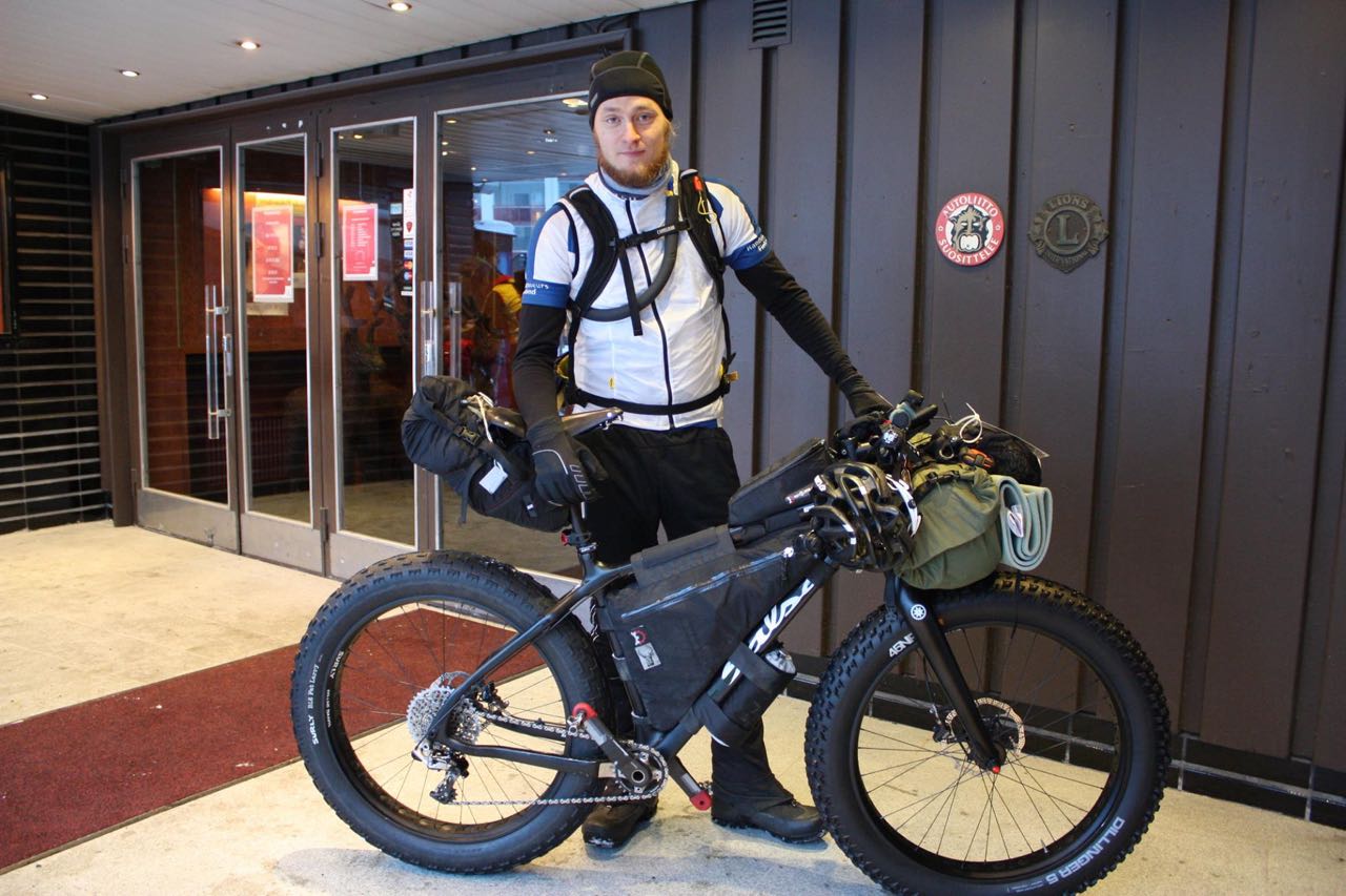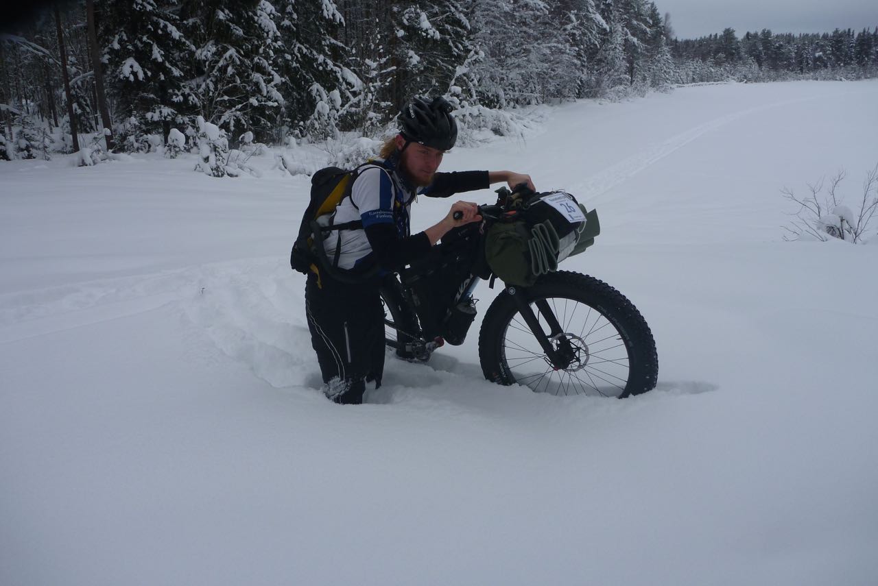 Unien jälkeen olin aivan innoissani, sillä hetken kelkkaura kantoi ja pääsin ajamaan. Tätä herkkua ei kuitenkaan kestänyt kuin hetken, sillä pian ajettu reitti loppui kokonaan ja täysin älytön tunkkaus alkoi. Jalat upposivat pohkeita myöden hankeen ja pyörän työntäminen oli todella raskasta. Seuraavan yhdeksän tunnin aikana liikuinkin noin 15 kilometriä. Matkan aikana pidin yhden vedenkeitto- ja ruokatauon, muuten puskin eteenpäin raskaampaakin raskaammassa hangessa. Välillä en erottanut kelkkauraa ollenkaan ja muutamia kertoja upposinkin hankeen lähes napaa myöden. Ajatus keskeyttämisestä rupesi hiipimään mieleen ja aloin kirjoittelemaan kannustusviestejä lumeen takanani tulevalle Lucalle. Toivottavasti edes joku kilpailijoista sai uutta voimaa näistä viesteistä. Pitkän, pitkän harkinnan jälkeen päätin kulkea vielä seuraavaan tienristeykseen ja tehdä siellä lopullisen päätökseni.