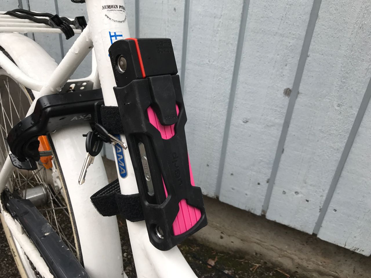 Lukitus tapahtuu helpoiten laittamalla lukko rungon ja renkaan välistä. Samassa lukon saa toki myös kiinni tolppaan tai johonkin elementtiin mikä on lähistöllä.