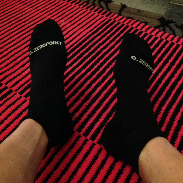 Päivän päätteeksi kun duunista kävelin kotiin ei jalat tunnu samalla tapaa kuin ehkä muutoin kovan aamutreenin jälkeen. Sama puntin jälkeen. Lisäksi olen käyttänyt töissä ja treenatessakin vielä noita Zeropointin nilkkasukkia. Sama idea kuin pitkissä sukissa ilman vartta. Paljasjalkakengän kanssa loistoyhtistelmä treenatessa tai töissä.