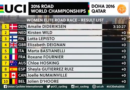 Kisan voitto meni niukasti Tanskan Amalie Dideriksenille. Toinen oli Hollannin Kirsten Wild. Voittaja käytti 134,5 km matkaan aikaa 3:10,27.